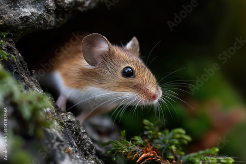 Close up of a brown mouse in the forest. Shallow depth of field.