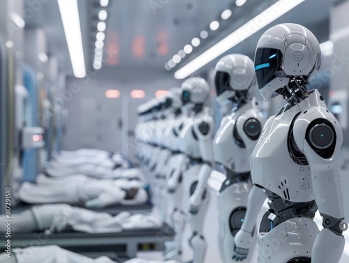 Close up of a bustling emergency room, where robotic assistants glide between patients, their HUDs displaying critical health stats in realtime, sharpen with copy space
