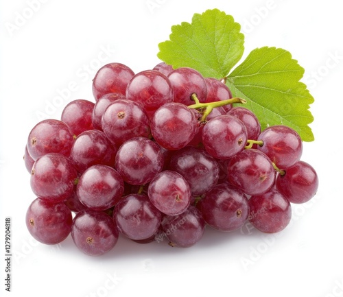 Close up of a cluster of ripe, red grapes with a green leaf on a plain background. The grapes are plump and juicy, and the image is well lit
