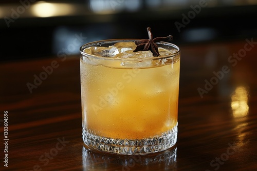 Close up of a cocktail in a glass with ice and a star anise garnish on a wooden table surface top