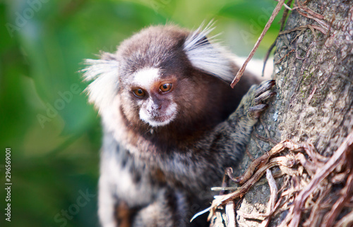 Close up of a Common marmoset (Callithrix jacchus), with a natural green bush background