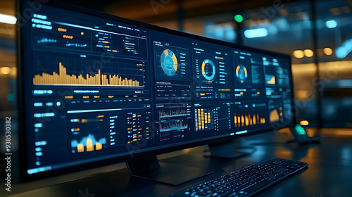 Close up of a computer monitor displaying data and graphs in a dark office.