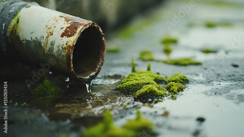 Close up of a cracked PVC drainpipe leaking water onto concrete, with green moss growing around it