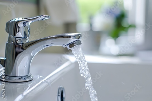 close up of a faucet and water flow on bathroom