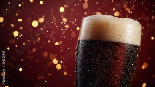 close up of a frosty glass filled with dark beer amber liquid foam and rising carbonation photographed against a rich dark red background with deep contrast