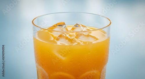 Close up of a glass filled with orange juice and ice cubes against a blurred blue background image