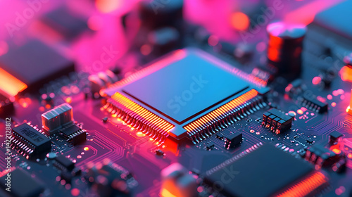 Close Up of a Glowing Blue Microchip on a Pink and Purple Circuit Board