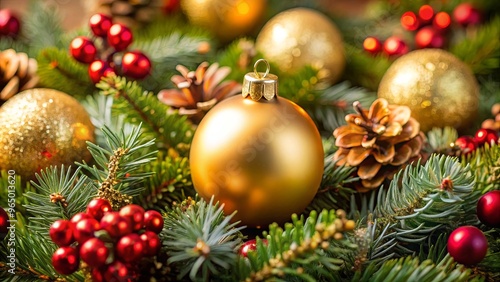 Close up of a golden bauble on a Christmas wreath, surrounded by festive decorations