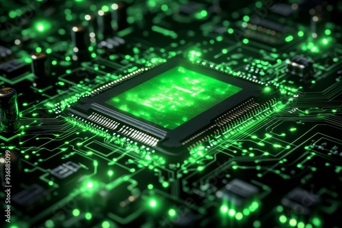 Close up of a green microchip on a circuit board with neon lights symbolizing the energy and connectivity of modern technology in a high tech environment