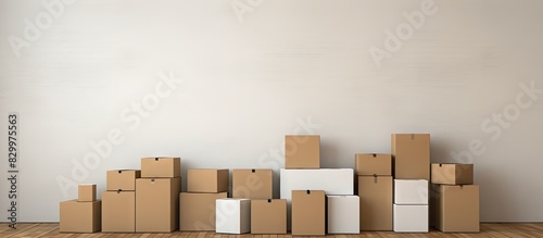 Close up of a group of cardboard boxes arranged against a copy space image of a white wooden wall