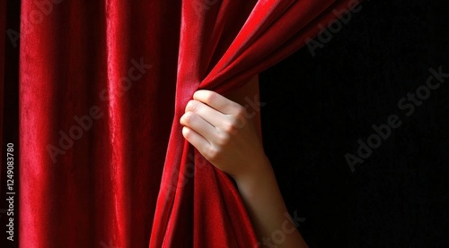 Close Up of a Hand Gently Pulling Aside a Red Velvet Curtain, Revealing a Mysterious Dark Space Beyond the Fabric Curtain
