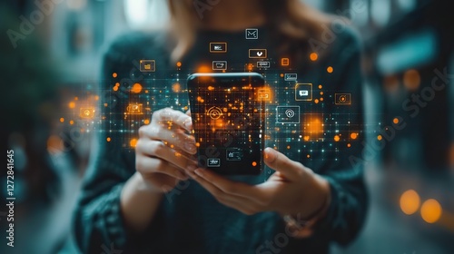 close up of a hand holding a smartphone with social media icons,notifications overlay representing digital communication,online networking in modern technology
