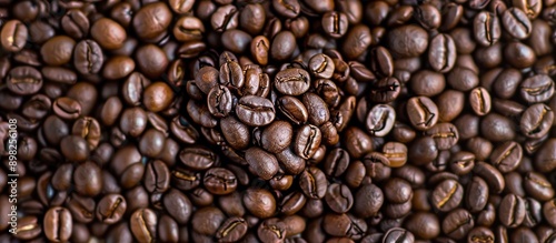 Close up of a heart shaped formation created with coffee beans on a background of roasted coffee beans emphasizing the concept of International Coffee Day with copy space image