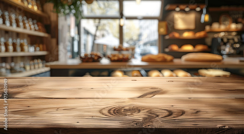 Close up of a horizontal minimalist wooden table top with a Blurred bakery shop background. Generative AI.