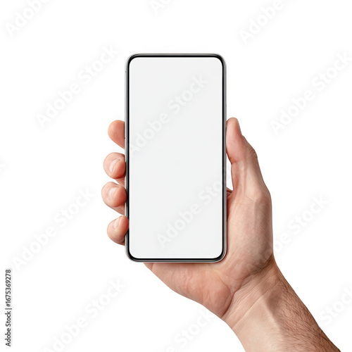 Close up of a human hand holding a modern smartphone with a blank white screen isolated on transparent background