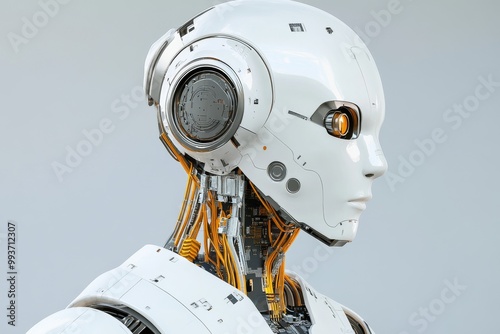 Close up of a humanoid robot in white and orange symbolizing advancements in robotics human machine interaction and the future of artificial intelligence in everyday life