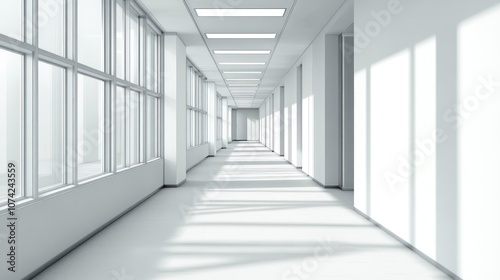 Close up of a long, bright corridor in a modern office building. Ai generated image