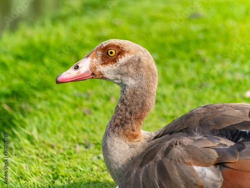 Close up of a male Egyptian goose (Alopochen aegyptiaca) Egyption Goose at a lake.
