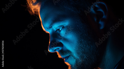 Close up of a man's face illuminated with blue light and a dark background creating a dramatic effect