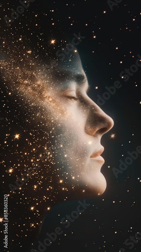 Close up of a mans face with starry sky, focus on, copy space, bright and celestial, Double exposure silhouette with night sky