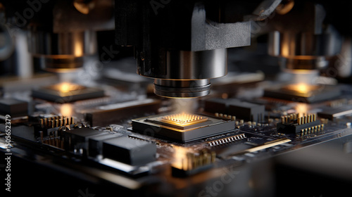 Close up of a Microchip Under Inspection with a Microscope Highlighting the Intricate Details and Advanced Technology in Electronics Manufacturing and Quality Control Processes