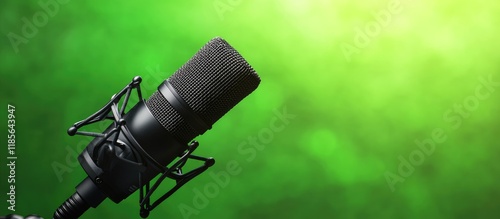 Close up of a microphone with a blurred green background suitable for music or broadcasting themes and space for text integration.
