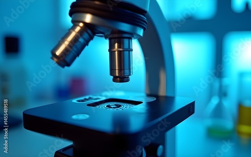 Close up of a microscope examining cells with a blue background in a laboratory setting for science. High quality