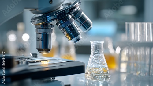 Close up of a microscope with an erlenmeyer flask in the background in a laboratory setting research