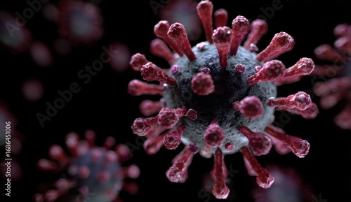 Close up of a microscopic virus particle with spikes on its surface showing its structure and detail