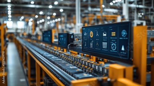 Close up of a modern factory production line with digital displays showing data and graphs.