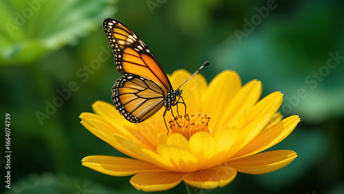 Close Up Of A Monarch Butterfly Perched Atop A Vibrant Yellow Flower With Green Foliage Behind It