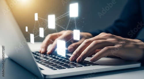 Close up of a person s hands typing on a laptop keyboard with glowing digital data visualizations and network connections appearing above