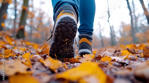 Close up of a person's feet walking on a path covered in fallen leaves.