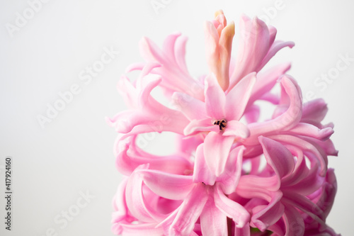 Close up of a pink hyacinth flower on a white background with copy space