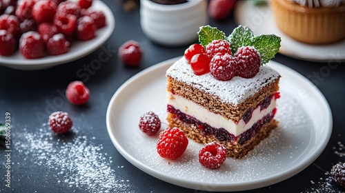 Close up of a raspberry cake with powdered sugar and mint on a white plate on a dark surface