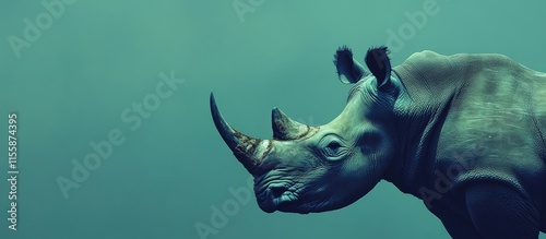 Close up of a rhinoceros in natural habitat with blank space for advertising or text overlay in a serene environment