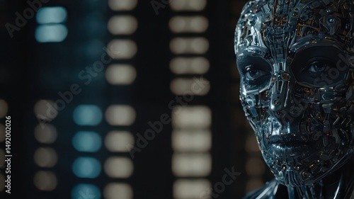 Close up of a robotic face with visible circuitry and a blurred background of lights behind it