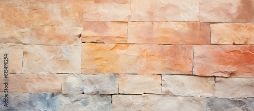 Close up of a stunning colorful stone wall with stucco and paint The background has a peachy orange and gray texture providing ample copy space