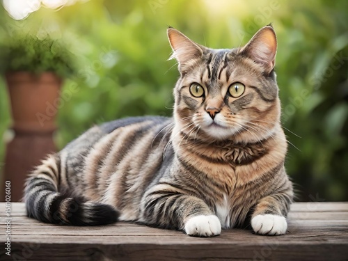 Close up of a tabby cat with green eyes lying on wooden surface, surrounded by soft light and a blurred green background.