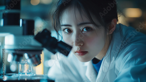 Close up of a woman in a lab coat looking intently at a microscope in a brightly lit laboratory