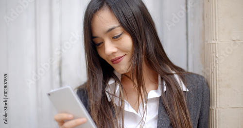 Close up of an attractive young brunette woman reading an sms on her mobile phone with a tender smile