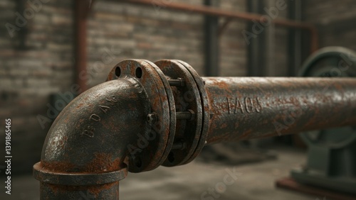 Close up of an old, rusty metal pipe with flanges in an industrial setting.