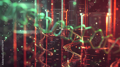 Close up of beakers and test tubes with a DNA double helix on a futuristic. rich brown background with a red and green gradient color.