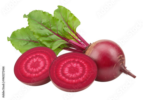 Close up of beets with green leaves and sliced beets isolated on transparent background