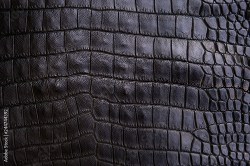 Close up of black Crocodile,Alligator belly skin texture use for wallpaper background.Luxury Design pattern for Business and Fashion.Top view surface in backdrop.