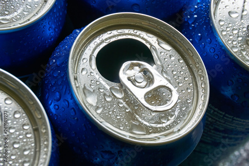 Close up of blue soda cans with open pull tab and condensation or water drops
