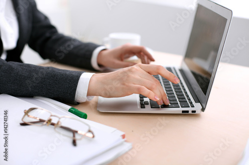 Close up of business woman hands typing on laptop computer in the white colored office.