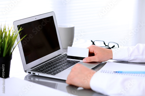 Close up of business woman hands using credit card and laptop computer