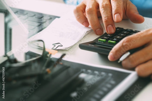 close up of businessman hand working with finances about cost and calculator and latop with mobile phone on withe desk in modern office