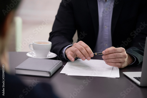 Close up of businessman sit at desk in office brainstorm discuss cooperation or financial document together, successful confident businesspeople meeting in boardroom consider partnership